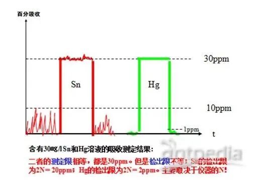 检测限是表征仪器检测能力的指标,表征仪器的灵敏度。可以指明对某个物质的最小检测量(如HPLC对萘的检测限为10-9mg/mL等),也可用S/N表示,一般用S/N=2为定性检测限。而定量检测时,有人用S/N=10表征检测限;但是一般用S/N=3(我国很多标准规定用S/N=2),也有用3倍标准偏差作为检测限的。测定限是指能测出的数据,与N无关。检测限和测定限的区别如下图: