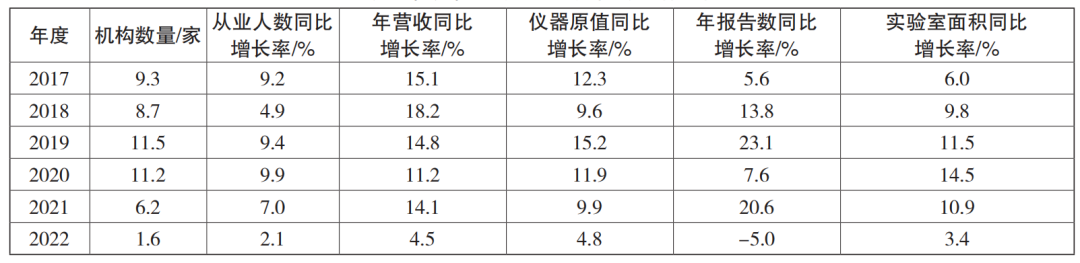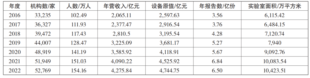 本文收集整理了2016—2022年度国家市场监督管理总局发布的检验检测服务业统计简报数据,如表1和表2所示,近年来我国检验检测行业除2022年报告数同比下降5.0%外,在机构数量、从业人数、年营收、仪器设备资产原值、实验室面积等指标上均实现了逐年增长,表明我国检验检测行业整体仍处于成长期,吸引了大量资本入局。但2022年度各项指标增速均明显放缓,反映了行业已告别野蛮扩张期,迎来发展拐点,市场竞争加剧、投资热情下降,淘汰洗牌和转型升级将成为行业后续主旋律。