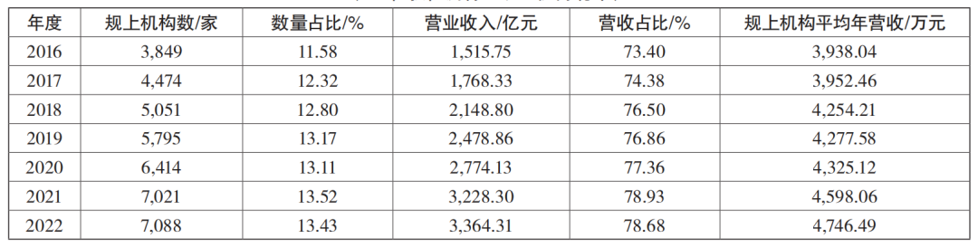 整理近年来我国检验检测行业规模以上机构(年营业收入1,000万元以上)情况如表3所示,可知我国检验检测行业呈现明显的“二八定律”,不到20%的机构瓜分了约80%的市场业务,行业营收集约化特征明显,但2022年规上机构数量同比仅增长0.95%,增速下降明显,表明小微机构规模扩大困难,市场竞争逐渐由增量市场的“跑马圈地”转变为存量市场的“零和博弈”。