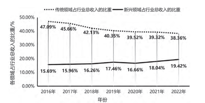 图1 2016—2022年新兴领域和传统领域行业营收占比情况